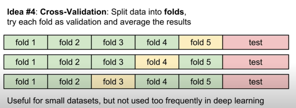 그리곤 나누어진 데이터셋 중 하나를 검증으로 사용하고 매 사이클 마다 다른 데이터셋을 검증용으로 사용하며 나온 값의 평균을 사용하여 하이퍼파라미터의 값을 조정하는 것이다.
